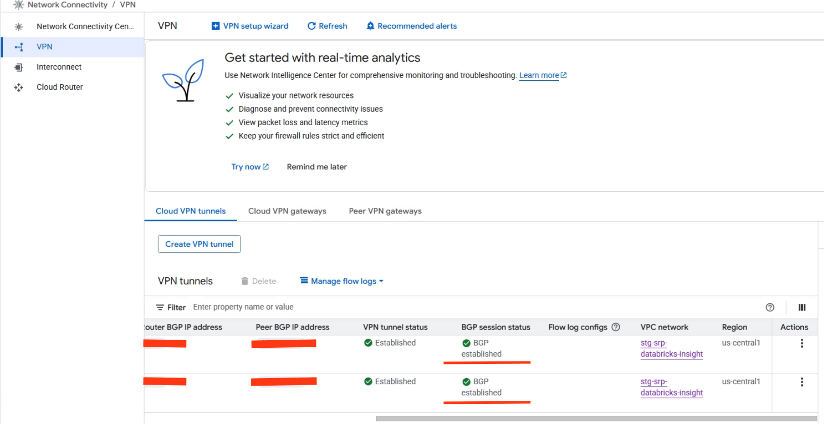 For hybrid connectivity (private communication between cloud-based Databricks clusters and on-premises source systems), a Cloud VPN with BGP Sessions was established to reach on-premises PostgreSQL databases. The VPN tunnels and BGP sessions need to be attached to the same Cloud Router in the same region as the VPC.